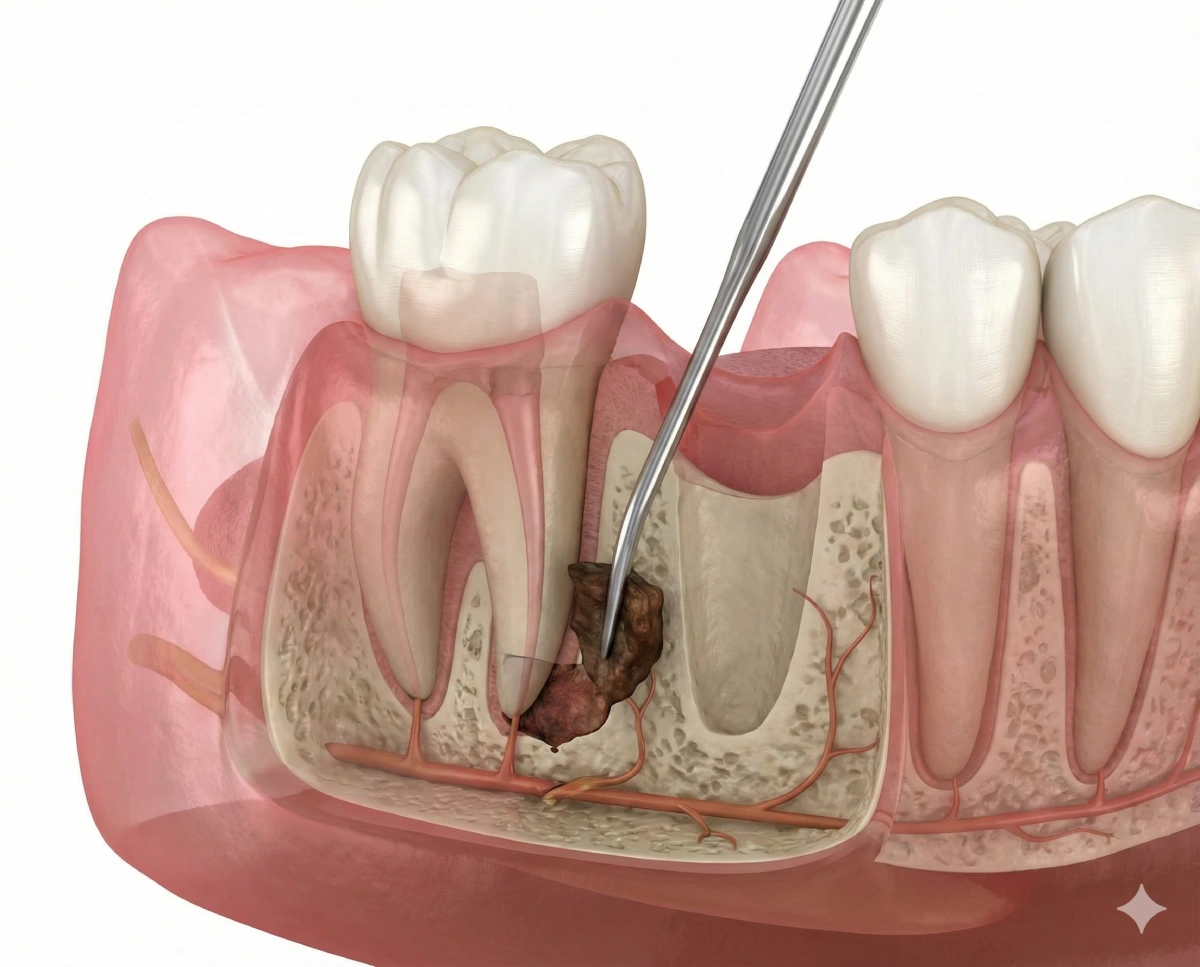 A procedure that removes infected pulp tissue from inside the tooth to relieve pain and save the natural tooth.